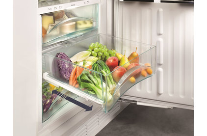 Жесткое крепление мебельного фасада по системе door on door позволяет широко открывать дверцу на угол 115°. Холодильное отделение объемом 245 литров оснащено восемью полками из ударопрочного стекла, которые можно отрегулировать по высоте. Четыре полки на дверце изготовлены из стекла с полосой из высококачественной стали и служат для размещения бутылок и консервов. Два контейнера VarioBox с крышками легко извлекаются и могут использоваться отдельно. Съемные контейнеры VarioSafe и система хранения Liebherr FlexSystem предназначаются для хранения небольших продуктов и упаковок и гарантируют самый удобный доступ к содержимому холодильной камеры. Режим суперохлаждения SuperCool позволяет снизить температуру в камере перед загрузкой свежих продуктов. Внутреннее наполнение зоны свежести BioFresh состоит из стеклянных полок, контейнера Dry Safe с пониженной влажностью для хранения мясных и молочных продуктов и двух отделений HydroSafe с повышенной влажностью для хранения овощей, фруктов, зелени. Все ящики удобно выдвигаются на телескопических направляющих SoftTelescopic. Высокий класс энергопотребления А+++ гарантирует экономичность прибора.