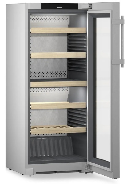 Винный холодильник Liebherr WPsd 4652 имеет две температурные зоны, в которых одновременно можно хранить разные сорта алкоголя и выставлять разные сочетания настроек. Он устанавливается отдельно, что удобно, если у вас есть специальное помещение — кладовая, погреб и т.д. Количество бутылок, которое можно разместить с учетом полной комплектации и из расчета объема бутылки 0,75 л, — 107 шт.